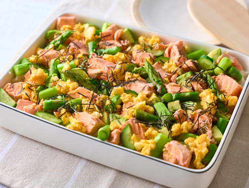「湯煮」をしたサーモンのやわらかさとらっきょうを入れたごはんの食感で、いつもと違うちらし寿司の味わいを楽しめます。